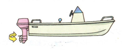 ハンドルを回すと、エンジン本体の向きを変えることにより、プロペラの向きを変える。(左に舵を切るとプロペラは左を向き水を左に押し出す、すると船尾は右に押し出され、船首は左に曲がっていく。)