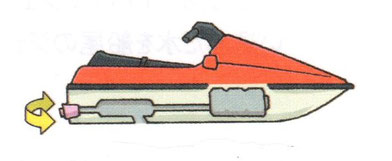 ハンドルを回すとプロペラの後ろにある舵板の向きが変わる。(舵板でプロペラで後ろに押し出された水流の向きを変える)