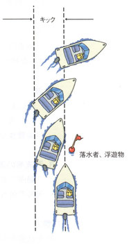 キックを意図的に利用すれば、船からの落水者(右舷側に落水した場合は、直ちにニュートラルにするとともに右にいっぱい舵を取ります。)や水面の浮遊物をプロペラに巻き込まないよう船尾を振って避けることができます。