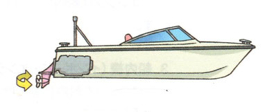ハンドルを回すとプロペラを回すドライブユニットの向きがかわり、プロペラの向きが変わる。エンジンは船内に固定されていて方向を変えない。