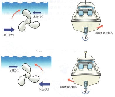 プロペラが回転するとき、水圧の深いプロペラの下部と上部では水圧が異なるために抵抗も変わってくるので、その差によって船尾を横に動かす力が発生します。