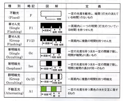 光り方(灯光の種別や周期)には左に示すようなものがあります。